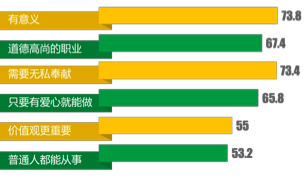 有意义 73.8 道德高尚的职业 67.4 需要无私奉献 73.4 只要有爱心就能做 65.8 价值观更重要 55 普通人都能从事 53.2 |