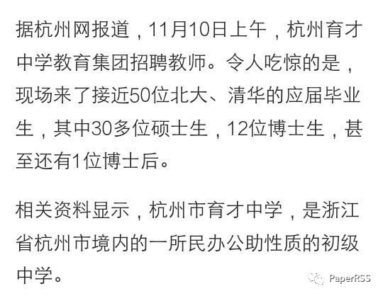 本文整合自网络 据杭州网报道,11月10日上午,杭州育才中学教育集团招聘教师。令人吃惊的是,现场来了接近50位北大、清华的应届毕业生,其中30多位硕士生,12位博士生,甚至还有1位博士后。 相关资料显示,杭州市育才中学,是浙江省杭州市境内的一所民办公助性质的初级中学。 据报道,两周前,育才中学专门去北大和清华做校园招聘。进入北大后,一小时就收到50多份简历,连高校的郜校长都感觉很意外。 这样的新闻无独有偶,就在前不久,中科院理学博士宋庆楠到烟台二中执教也引起了舆论哗然。而在人大附中每年公布的招聘教师名单中,该校的老师有不少都是清华、北大、北外、人大、并且学历最低都是硕士,还有海龟的博士。 为何北大、清华的高材生会纷纷去往中学执教呢? 难道是高校学历越来越贬值,工作越来越不好找,铁饭碗更是难求......?在种种疑惑的背后,而之前的人大附中为什么能吸引众多清华、北大的学子是因为人大附中基本上全国数一数二的名校,加之又在北京,解决户口之类的编制,将来自己的孩子也可以享受这样的资源。 不管是出于何种考虑,诚如杭州育才中学校长郜晏中所说:想给孩子最好的教育,就从先给孩子最好的老师开始。”高素质的优秀人才能进入到我国基础教育的体系内,为该体系补充新鲜的思想与血液,长期以往这是受教育者的幸运,也能促进我国基础教育的长远发展。 我们注意到此次育才中学招聘中的一个细节,就是此次育才中学招聘的老师起薪是30万。这个待遇应该说在整个就业市场都是非常可观的。因此,这也从某种侧面回答了为什么能吸引众多优秀人才前往的原因。 然而,像育才中学,人大附中毕竟是少之又少的,这些毕竟是我国的发达地区,而全国更大范围的基础教育发展并不乐观,长期以来,我国基础教育阶段老师的工资待遇始终是被人诟病的。 10月9日,《教学十九载,我终于辞职了!》一文火了!讲述的是河南省南阳市内乡县第五小学的优秀教师张景娟(化名:金小贝)因不满工资待遇辞职,引起了社会对教师工资的讨论。 张景娟作为省骨干教师,完成过省级课题,多次荣获市县优质课大赛大奖,教学成绩名列市县前茅。然而,就是这样一位优秀教师,每个月的工资只有2600元。 我们经常说“尊师重教”,但是这些不应该是仅仅停留在口头上,教师的工资改革已经迫在眉睫。就在今年两会期间,教育部部长曾经在对外公开表示:教师的工资将不低于公务员工资待遇。要想促进教育的整体均衡发展,提高教师待遇,优化教师队伍建设,无疑是其中非常重要的一环。