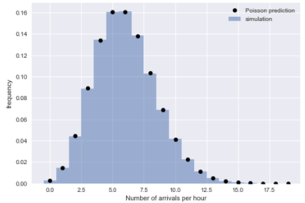 通过再次检查这个推断,我们可以确认它与泊松过程的另一个属性的相匹配:在固定时间范围内到达公交的数量将是泊松分布的。让我们将模拟到达的时间按小时分桶检查一下: