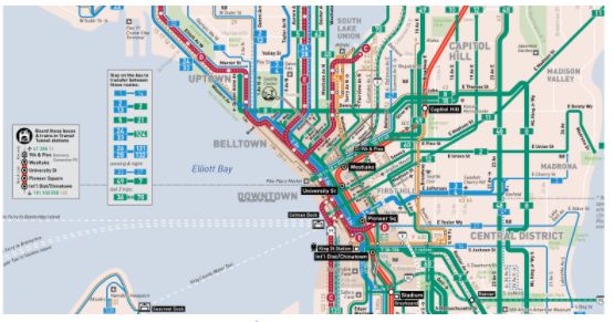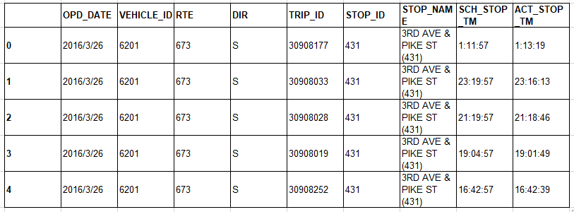 该数据集包含2016年第二季度记录的西雅图市中心3rd & Pike公交站的西雅图Rapid Ride C、D、E线的预定和实际到达时间。
