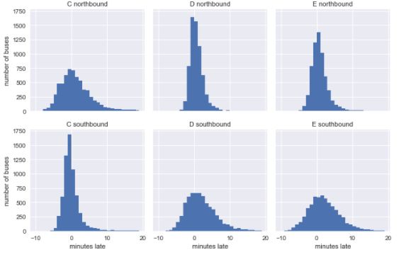 你可能会认为公交车每次在行程开始时与其时间表更接近,并且在快结束时有更多的差异,这在数据中得到了证实:南行(southbound)C线和北行(northbound) D线、E线都在各自路线的起点接近时间表,而其反方向在终点时更接近。