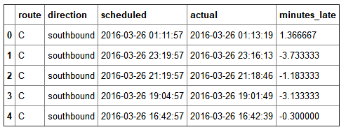df = df[['route', 'direction', 'scheduled', 'actual', 'minutes_late']].copy()