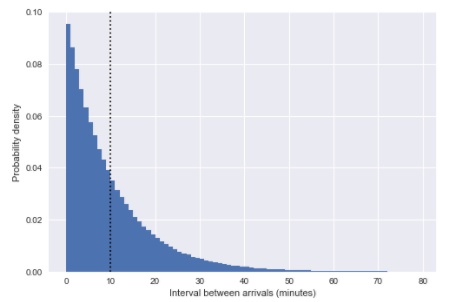 这里的垂直虚线表示平均的间隔大约为10分钟。这看起来非常像指数分布,而且并非偶然:我们将公交车的到达时间模拟为均匀随机数,这非常接近于泊松过程,对于这样的过程,可以证明到达之间的间隔分布是呈指数分布的。