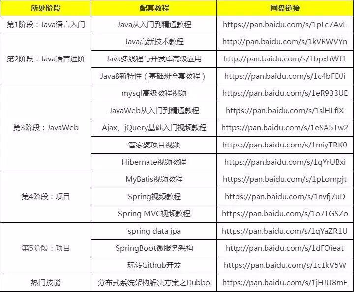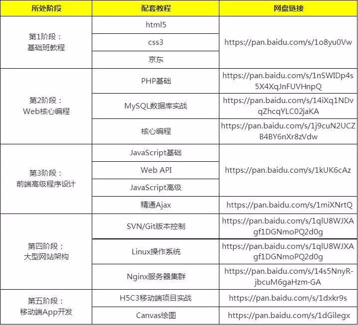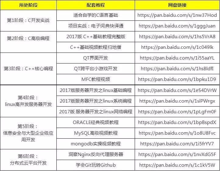 01 Java 1. Java学习路线图---学习大纲及各阶段知识点 2. Java学习路线图---配套视频推荐 3. Java学习各阶段配套书籍推荐 02 前端与移动开发 1. 前端与移动开发学习路线图---学习大纲及各阶段知识点 2. 前端与移动开发学习路线图---配套视频推荐 3. 前端与移动开发学习各阶段配套书籍推荐 03 Python 1. Python学习路线图---学习大纲及各阶段知识点 2. Python学习路线图---配套视频推荐 3. Python学习各阶段配套书籍推荐 04 云计算大数据 1. 云计算大数据学习路线图---每阶段需掌握的核心能力 2. 云计算大数据学习路线图---配套视频推荐 05 PHP 1. PHP学习路线图---学习大纲及各阶段知识点 2. PHP学习路线图---配套视频推荐 3. PHP学习各阶段配套书籍推荐 06 C++ 1. C/C++学习路线图---学习大纲及各阶段知识点 2. C/C++学习路线图--配套视频推荐 3. C/C++学习各阶段配套书籍推荐 07 UI/UE 1. UI/UE学习路线图---学习大纲及各阶段知识点 2. UI/UE学习路线图--配套视频推荐 3. UI/UE学习各阶段配套书籍推荐 08 新媒体运营 1. 新媒体运营学习路线图---学习大纲及各阶段知识点 2. 新媒体运营学习路线图--配套视频推荐 3. 新媒体运营学习各阶段配套书籍推荐 09 H5+全栈工程师 1. H5+全栈工程师学习路线图---学习大纲及各阶段知识点 2. H5+全栈工程师学习路线图--配套视频推荐 3. H5+全栈工程师学习各阶段配套书籍推荐 10 Go语言+区块链 1. Go语言+区块链学习路线图---学习大纲及各阶段知识点 2. Go语言+区块链学习路线图--配套视频推荐 11 配套学习工具 Java Java开发环境和文档 mysql-Windows客户端工具 mysql-Windows客户端工具 myeclipse tomcat jdk-Windows Python 虚拟机安装包及ubuntu16.04 python环境及IDE 前端与移动开发 web前端与移动开发配套工具(打包) webstorm C++ C++界面的编程的首选--Qt 虚拟机软件安装包 PHP php环境搭建软件 php环境搭建软件 linux各种软件 linux各种软件 Mongodb软件 UI/UE UI/UE设计配套工具(打包)