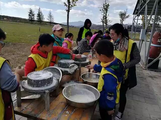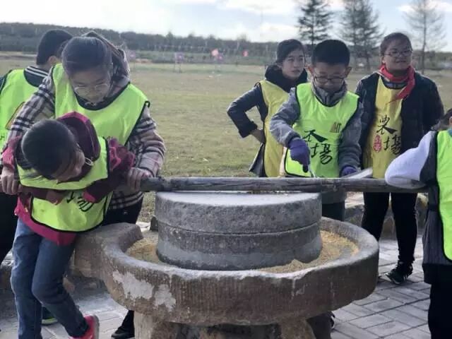 来了一拨威海环翠国际中学的初三大哥哥大姐姐,四三中队的孩子们真的很有爱心,耐心的教他们怎么磨玉米面,教官们在一旁赞不绝口。