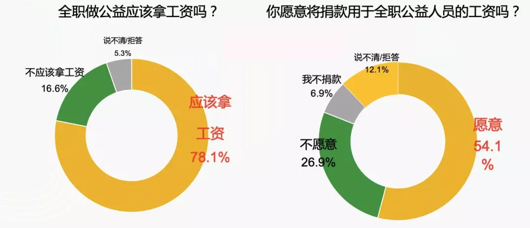 在2018年的公众调查中,78.1%的人认为全职做公益应该拿工资。54.1%的人愿意将自己的捐款用于全职公益人员的工资。在工资水平上,38.1%的人“没意见,由公益机构自己决定”,26.8%的人认为应拿与同等人员相比持平的工资,甚至还有12.5%的人认为应该拿更高的工资。