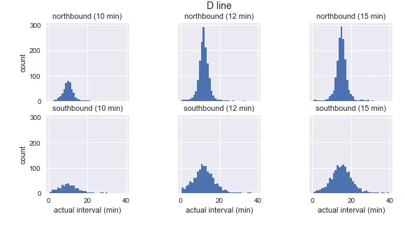 使用这些清理过的数据,我们可以绘制不同路线、方向和到达频率的“实际”到达间隔的分布: