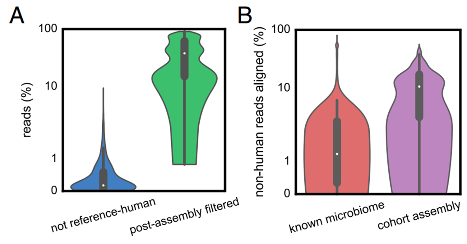 人为混合 8,068个细菌基因组序列,比对之后大多数的细菌基因组没有被删除,证明数据比对的pipeline比较准确地识别细菌基因组与人基因组。