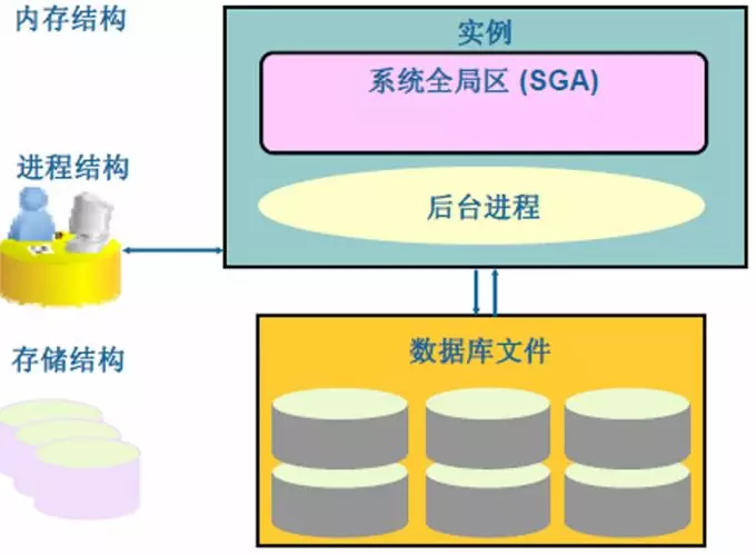 Database由一些物理文件(如:存放在存储设备中的二维表文件)组成。二维表存储在Database中,但Database的内容不能被用户直接读取,用户必须通过Oracle instance才能够访问Database,一个Instance只能连接一个Database,但是一个Database可以被多个Instance连接。
