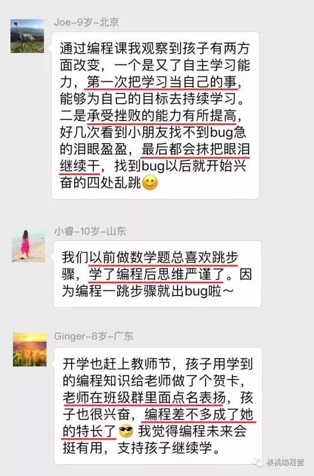 4、程序有错就不会按编程者的意愿运行,这可以让孩子意识到粗心的危害,并逐步养成细心的习惯 学编程的孩子都知道:编程世界里从没有“差不多”二字,只有“严谨和准确”。我身边很多孩子学完编程后,做计算题都莫名其妙的不跳步骤了,后来问了孩子才知道,编程写多了,跳了步骤怕程序“走不通了”。
