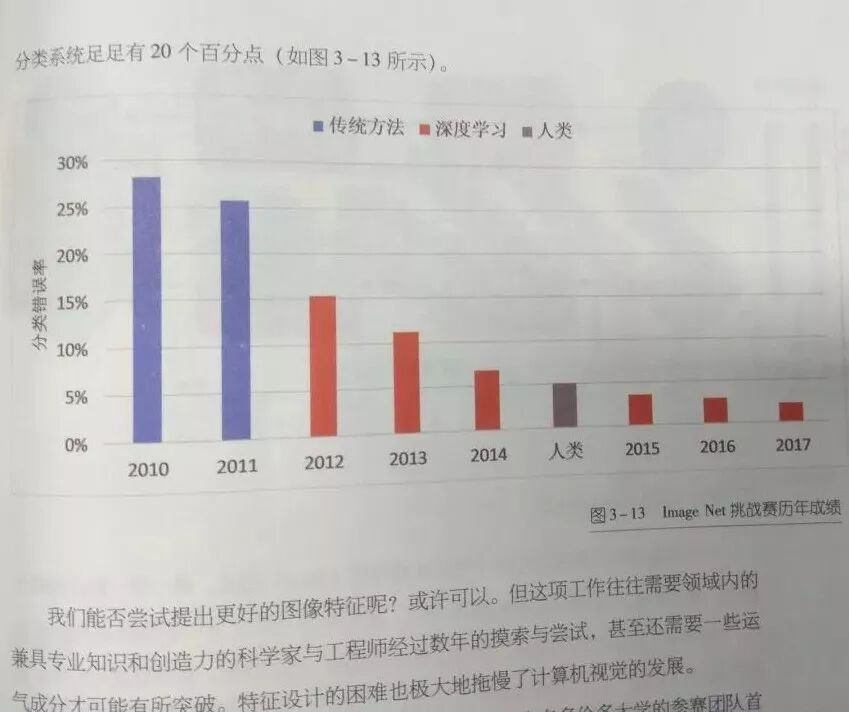 此外,这一章里编者也补充了关于深度神经网络的一些其他知识,比如ImageNet多年以来准确率的不断提升、数据与计算能力对神经网络 发展的限制、过拟合与欠拟合,还有笔者完全没看懂的梯度消失。